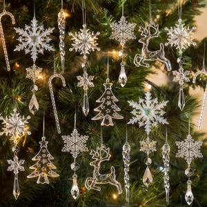 18pcs Clear Crystal Snowflake & Icicle Christmas Tree Ornaments Set – Acrylic Hanging Drop Pendants for Winter Wonderland, Chandelier